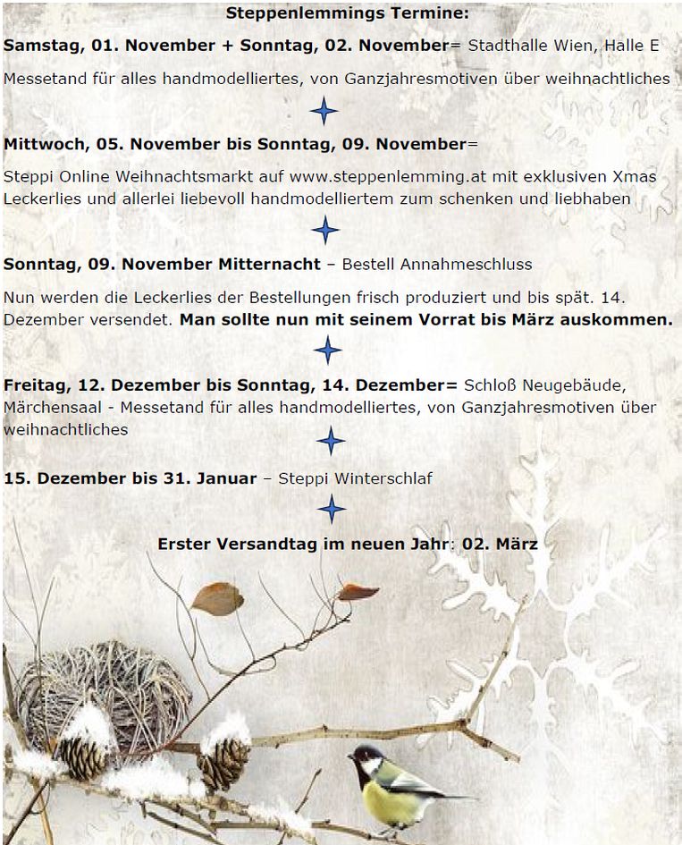 Der Weihnachtsmarkt mit seinen exklusiven Steppi Artikeln ist AB SOFORT bis inkl. Sonntag, den 09. Nov geöffnet.